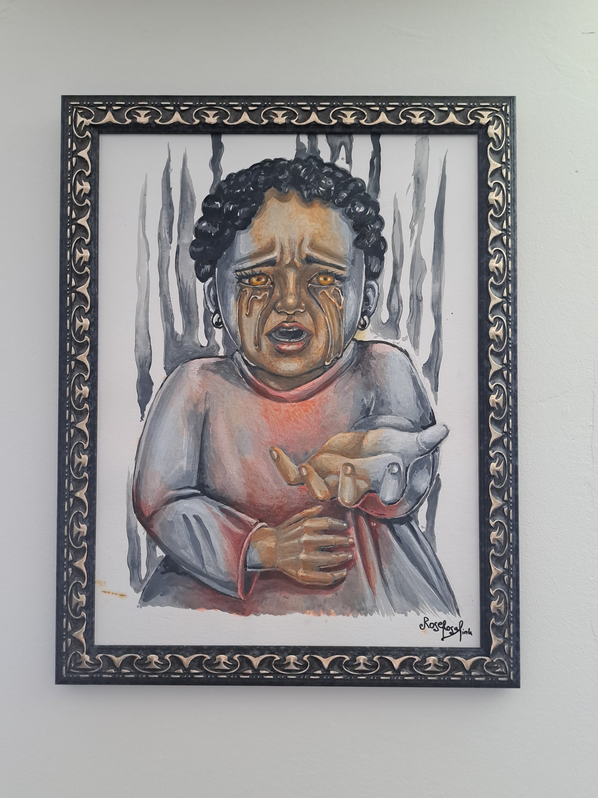 Dieses Gemälde thematisiert weibliche Genitalverstümmelung. Weibliche Genitalverstümmelung ist ein entsetzlicher und zutiefst traumatisierender Eingriff, bei dem die intimsten Körperteile junger Mädchen gewaltsam beschnitten werden, oft ohne Betäubung, medizinische Versorgung oder Rücksicht auf ihr Wohlbefinden. Diese Mädchen erleiden unerträgliche Schmerzen, nicht nur in diesem schrecklichen Moment, sondern oft ihr ganzes Leben lang. Zu den körperlichen Folgen können chronische Infektionen, starke Blutungen, Komplikationen bei der Geburt und lebenslange sexuelle Funktionsstörungen gehören. Die emotionalen und psychischen Narben sind ebenso tief: Trauma, Angstzustände, Depressionen und ein zerstörtes Gefühl von Sicherheit und Selbstwertgefühl.