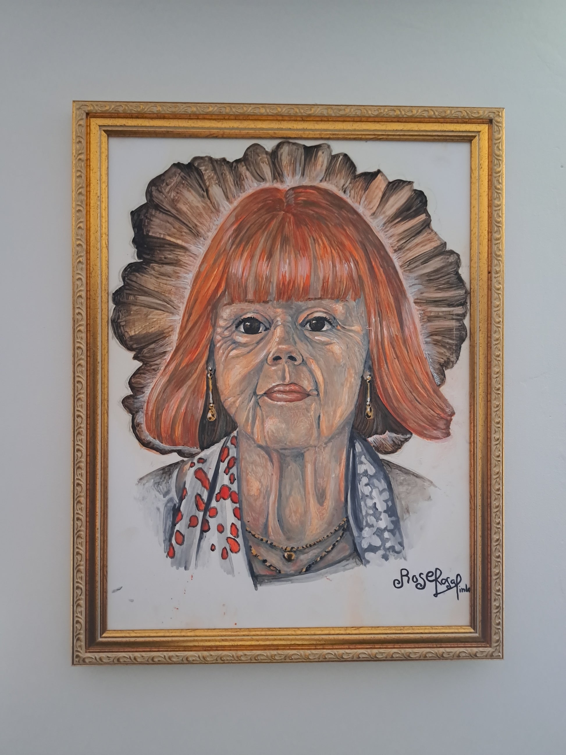 In diesem Gemälde habe ich sie mit einem „Blumenkranz“ dargestellt. Denn Blumen sind mein künstlerisches Symbol und einfach ein wunderschöner Teil der Natur.